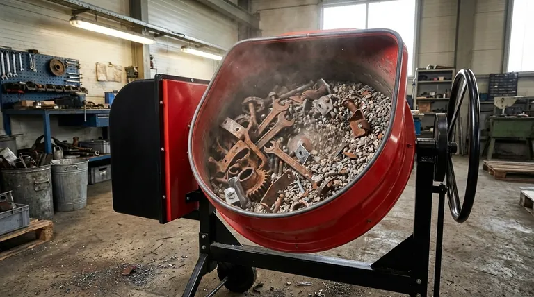 标准的混凝土搅拌机非常适合这项任务。其倾斜的滚筒和内部叶片设计用于提升和混合重物,确保零件和介质持续运动,而不是仅仅在底部滑动。这保证了所有表面都能得到一致的清洁。